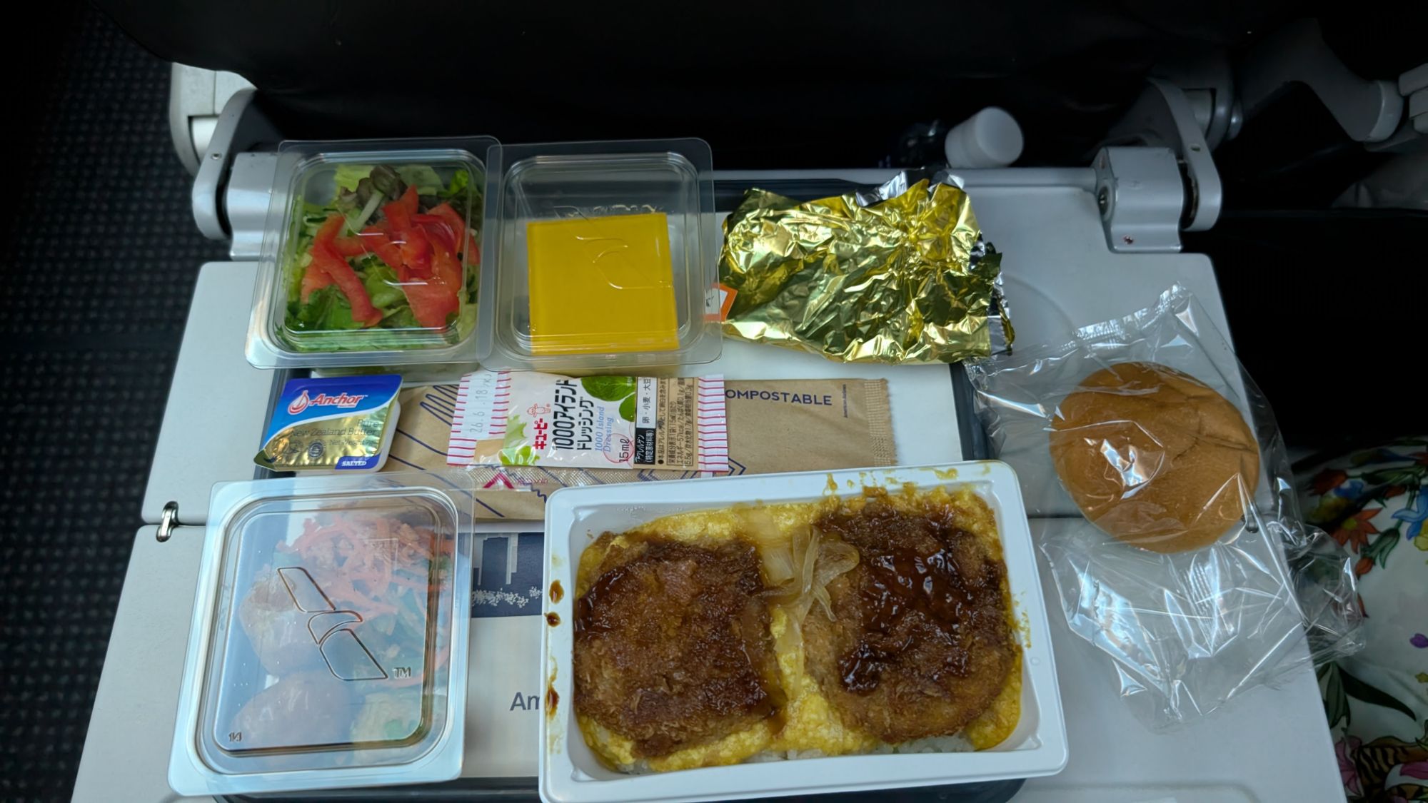 まずは離陸後1時間ほどで、1回目の機内食となりました。選択肢としては、ポークカツとビーフ&マッシュポテトがあると言っていました。