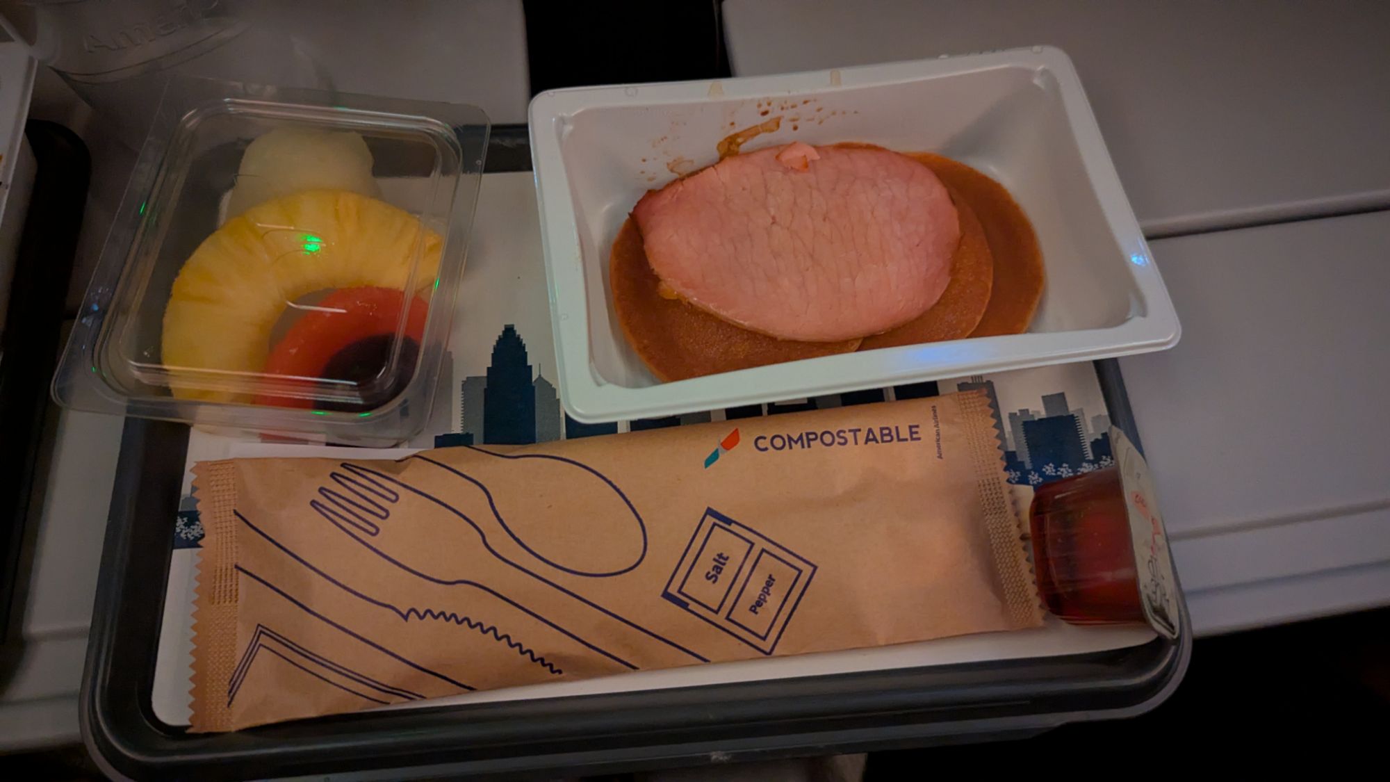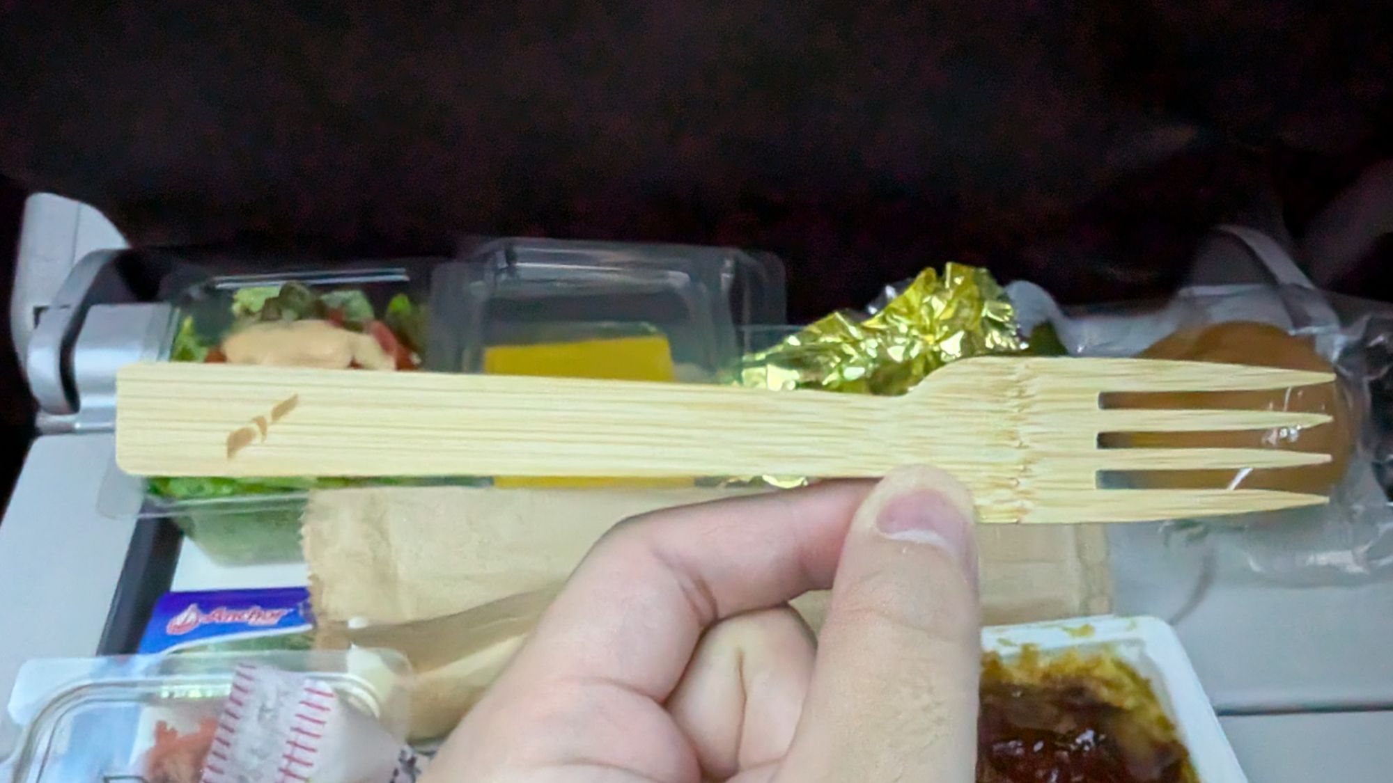 カトラリーは竹でできたものでした。近年は環境への配慮からか、使い捨てでないものを使用するエアラインも多いので、逆に新鮮でした。アメリカンのロゴも入っていておしゃれです。