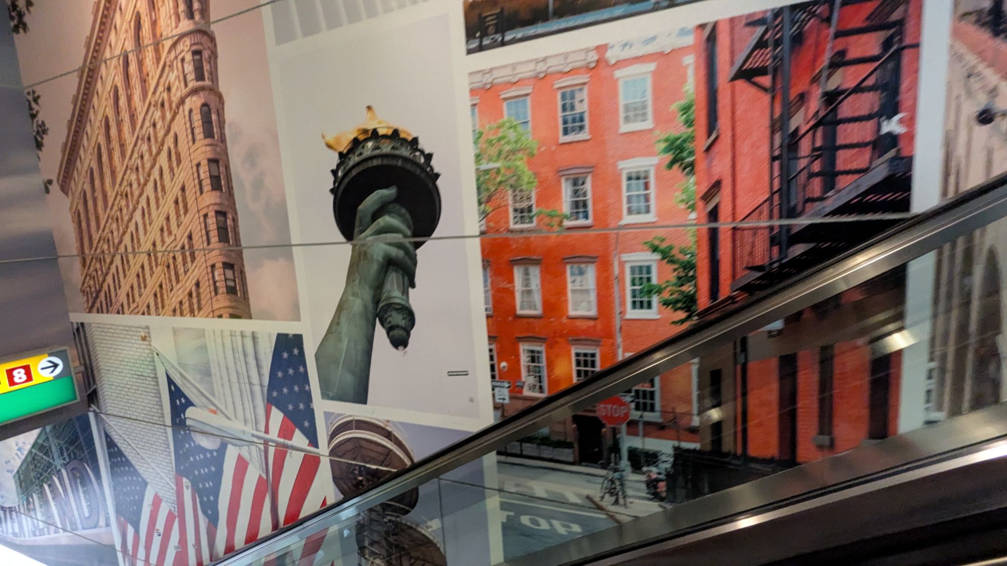 ただ、広い空港だけあって、降りてから入国審査までの道のりが長かったです。写真は、途中のエスカレーター脇にあるおしゃれなラッピング。