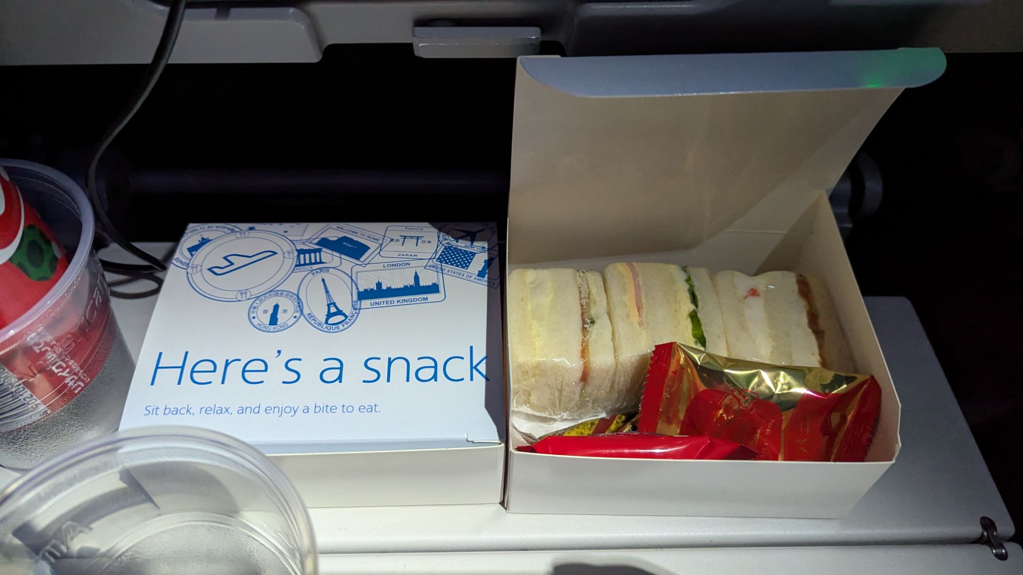 内容はというと、サンドイッチ、キットカット、カントリーマアムというもの。ここでは選択肢はなく、1種類でした。日本時間でいうと23時半、ニューヨーク時間だと朝9時半なので、朝食という位置づけなのかな?となると、さっきの1食目は何だったんだ?となるので、考えるのはやめてとにかく食べました。