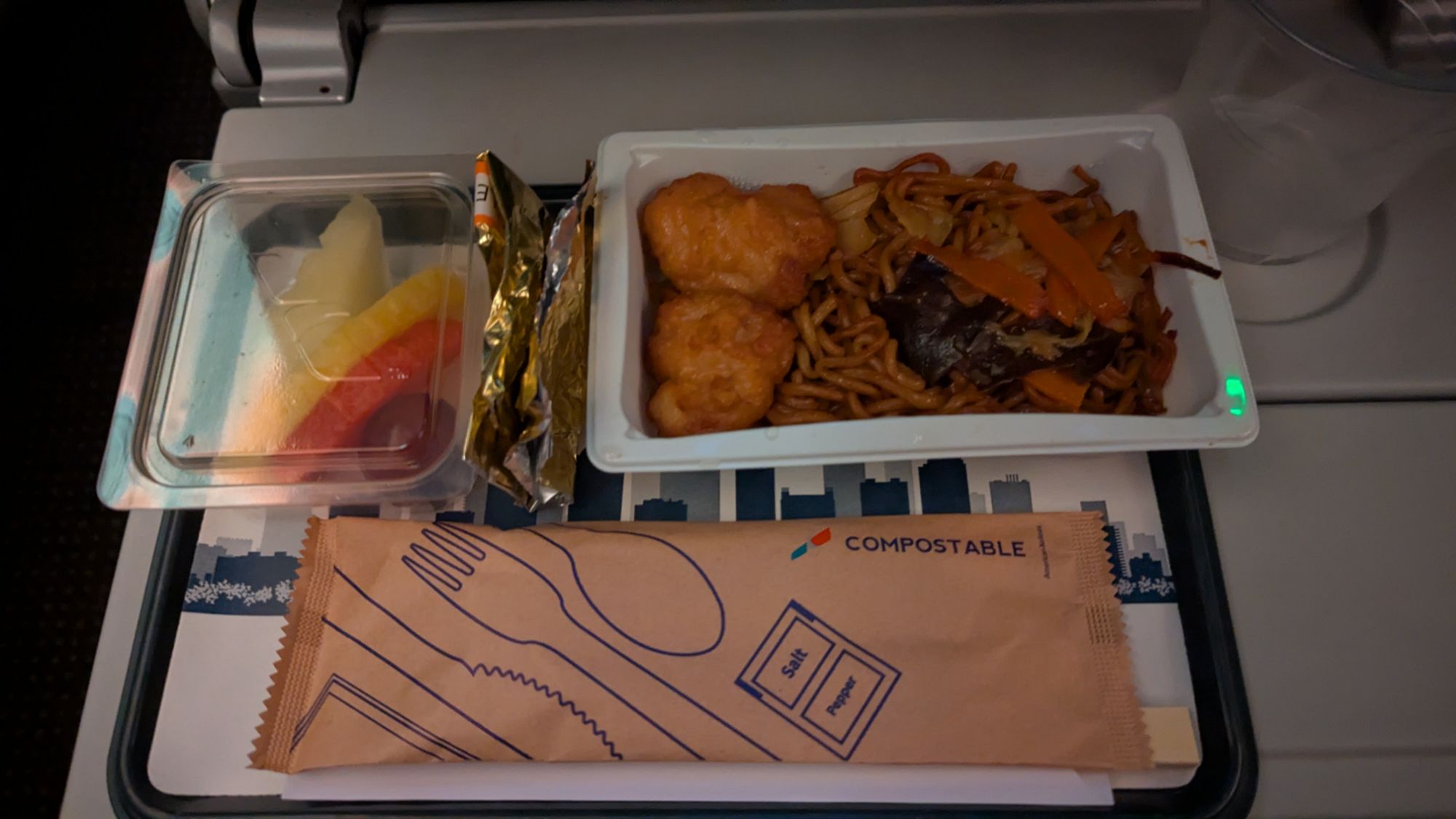 そしてこちらが焼きそばです。こちらはかなりおいしかった記憶です。やはり日本発便は和食のほうがクオリティが高いのでしょうか?