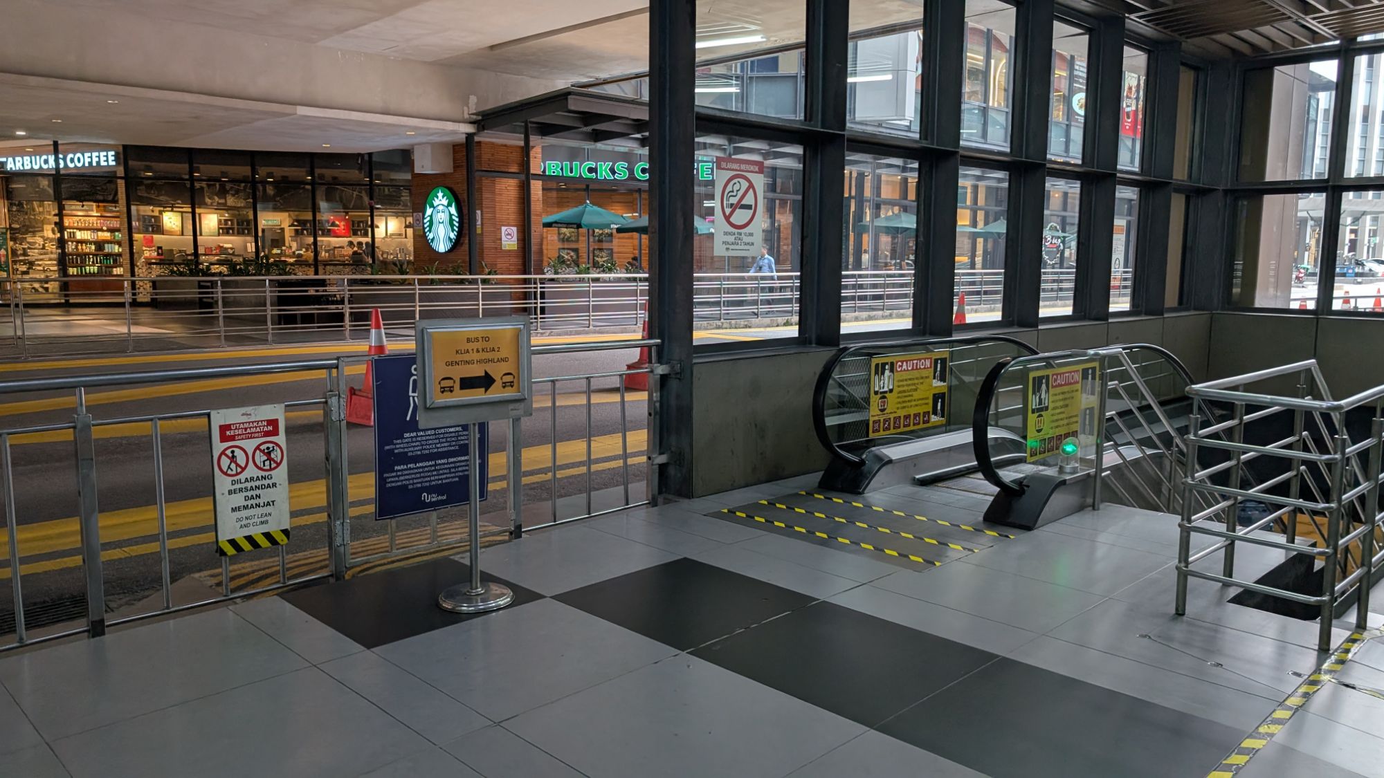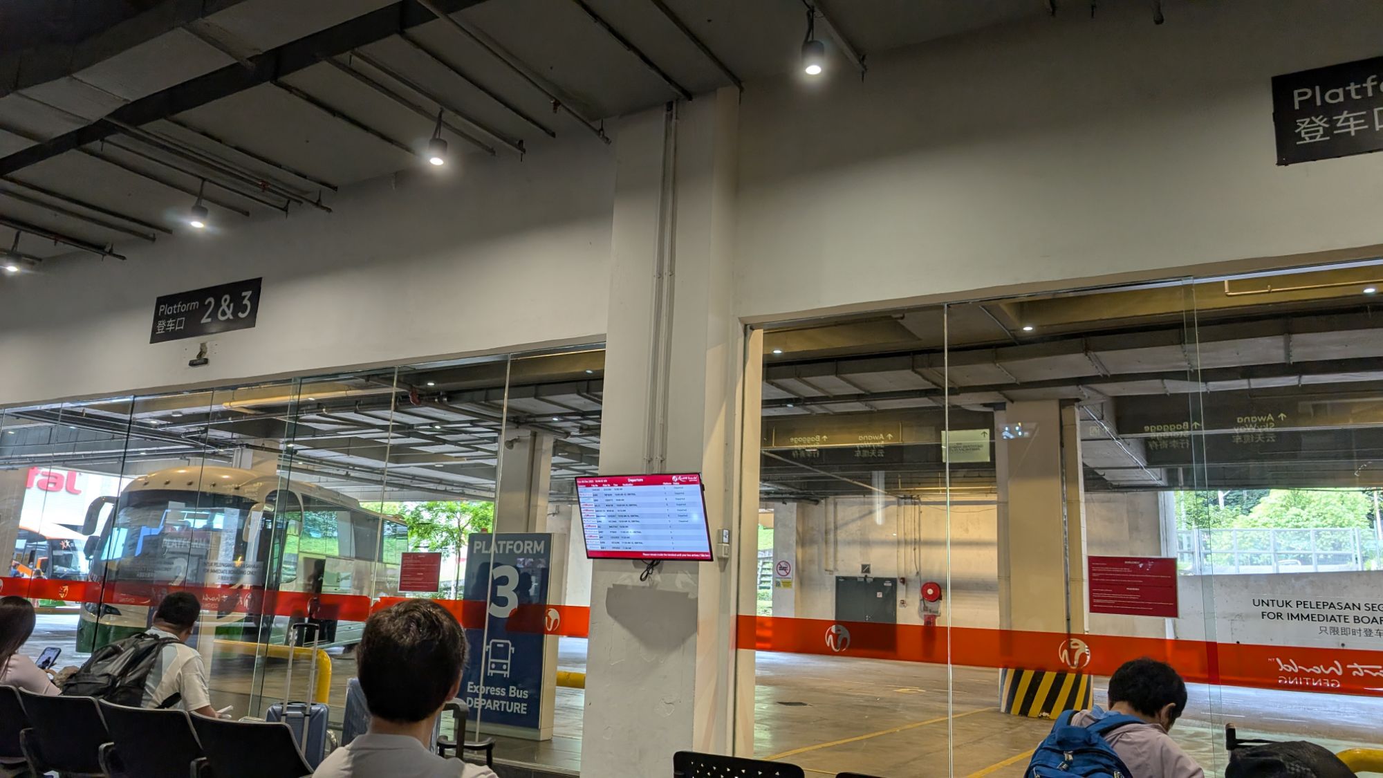 エスカレーターを降りた先のフロアはこんな感じ。右手に停車していたバスが、今回乗るバスでした。バス入り口付近に立っていた係の人に、バウチャー(予約完了メールのPDF)を見せて、車内に乗り込みました。Resort World Gentingで予約している場合はQRコードもバウチャーに含まれていますが、これはロープウェイ用。ここでは使いません。