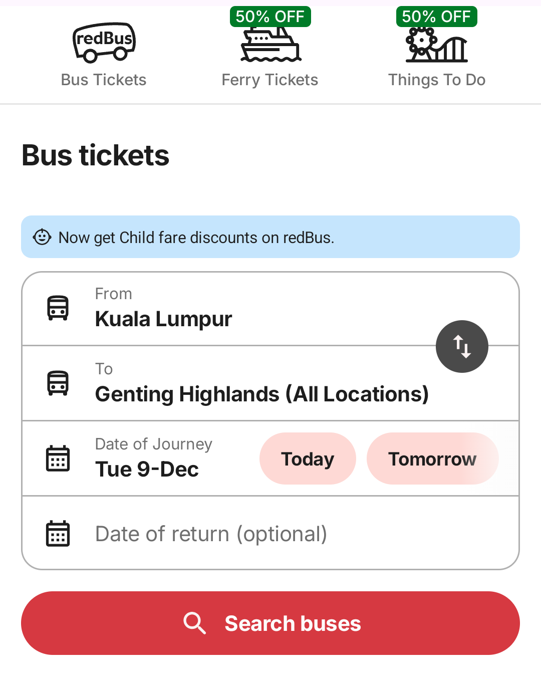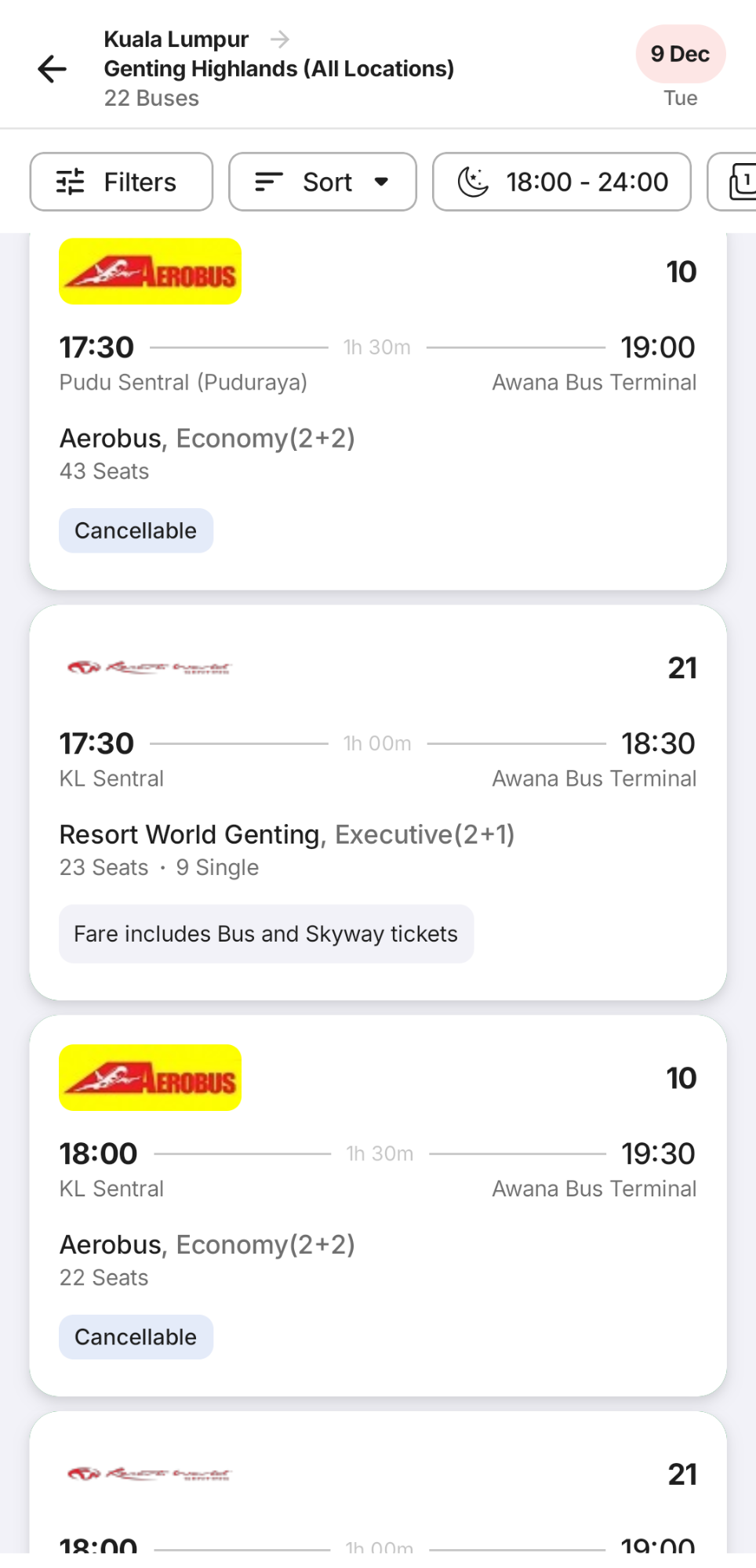 こんな感じで、出発地にKL、到着地にゲンティンハイランドと入力して検索します。