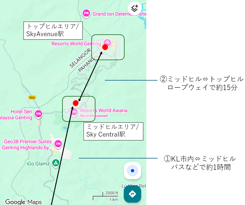 まとめた図がこちらです。このマップの少し南のほうにKLがあります。ゲンティンハイランド一口に言っても、大きく2つの地域に分かれており、それぞれ決まった名称はないものの、ミッドヒル・トップヒルなどと呼ぶことが多いです。