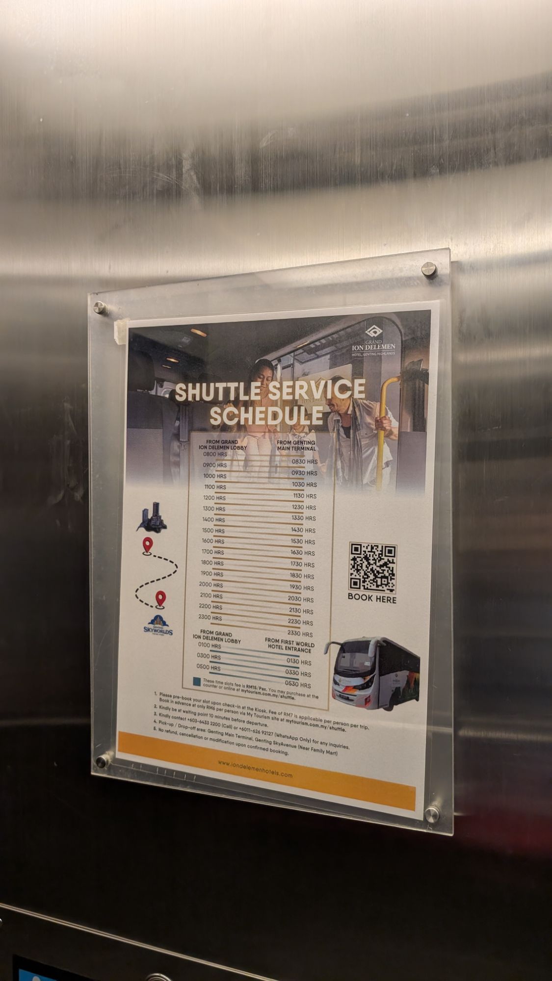 ホテルは、ゲンティンハイランドのトップヒル(SkyAvenueなどがあるところ)からさらに車で10-15分程度離れた場所にあります。自家用車などで行く場合は直接ホテルへ向かいます。公共交通機関で行く場合には、SkyAvenueからはシャトルバスでの移動になります。写真の通り、毎時1本の間隔で運行しているようです。
