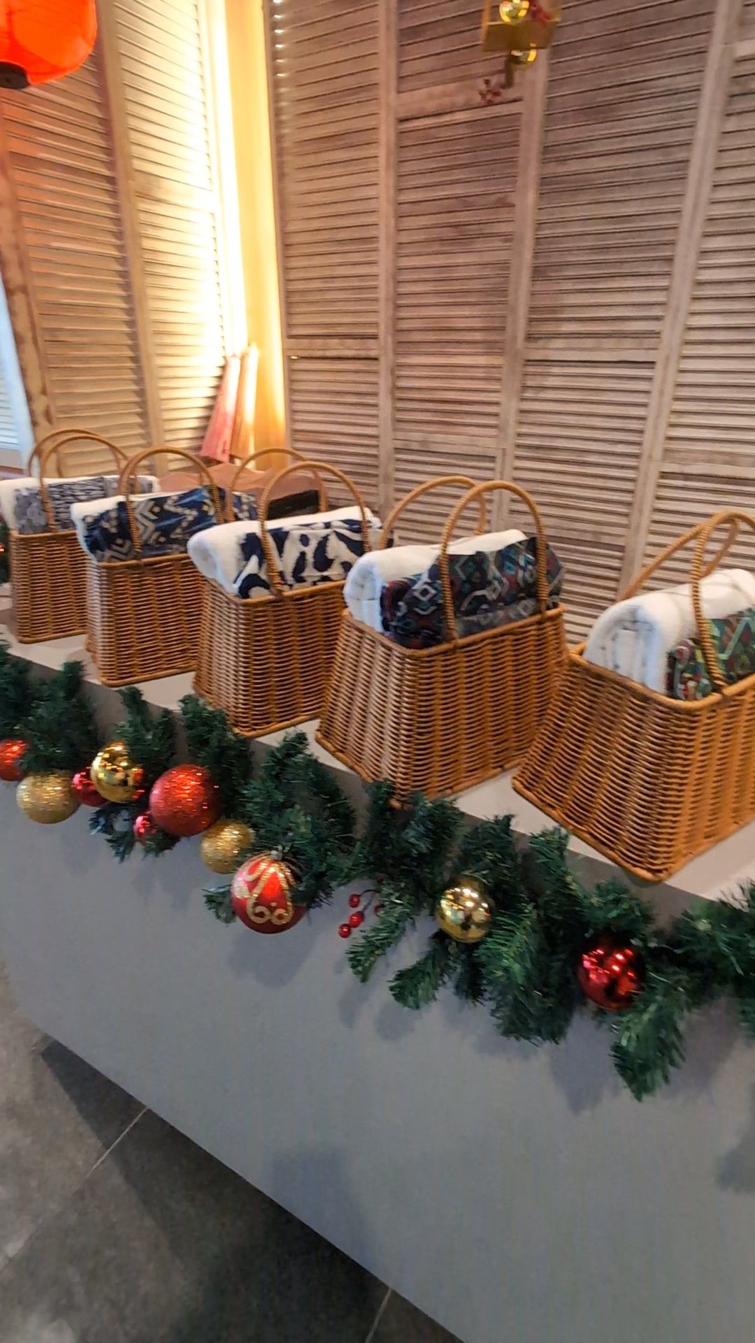 こちらが受付の様子。タオル・浴衣・帯が入ったかごがいくつか置いてありますので、好きな浴衣を選んで受け取ります。男性用・女性用・子供用があるらしいですが、一緒くたに置いてありますので、受付の人に聞いてみるのがいいかもしれません。Openプランの場合には、ここでタオルのみ受け取ります。(12月に行ったからか、クリスマスの装飾もありました笑)