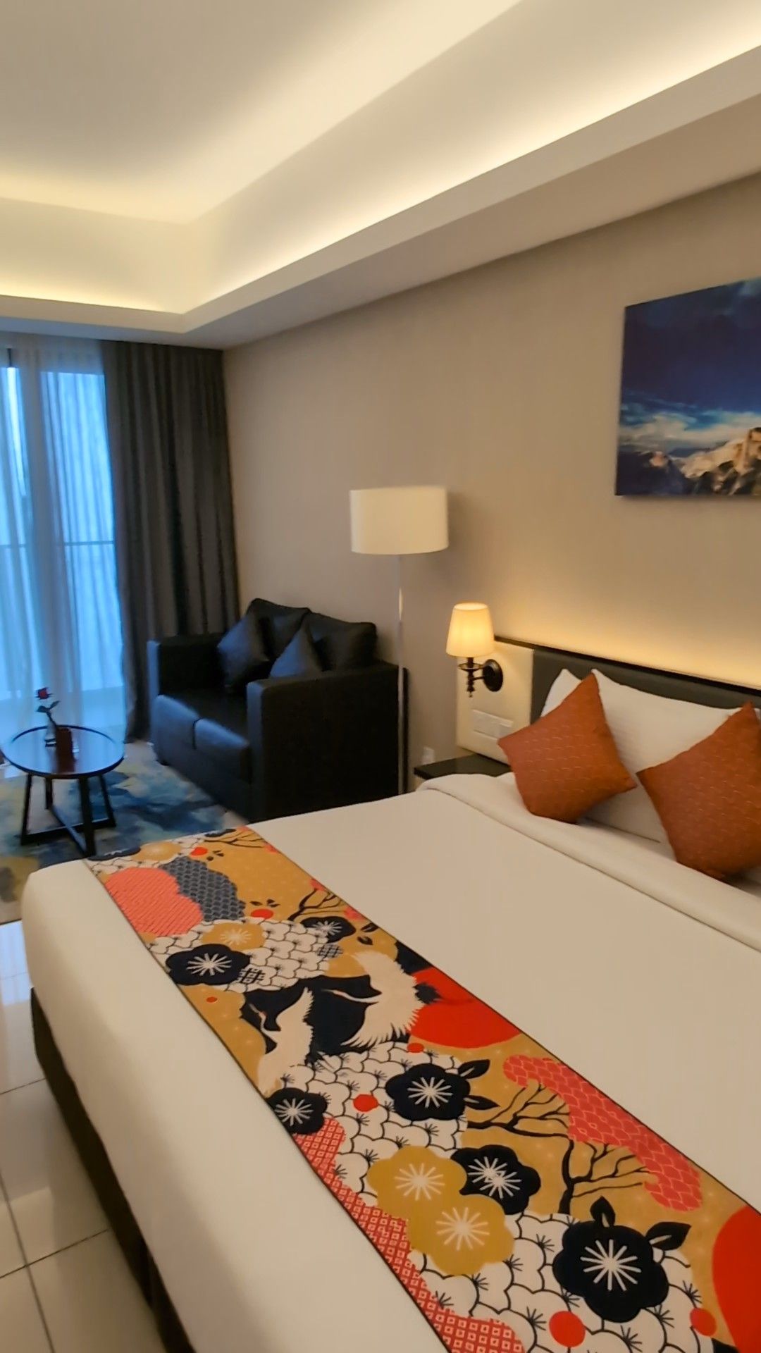 今回はPremier Studio Suiteというタイプにしました。客室は特に特別なことがあるわけではないのですが、ベッドの足を載せる部分は鶴などが描かれていて日本風ですね。