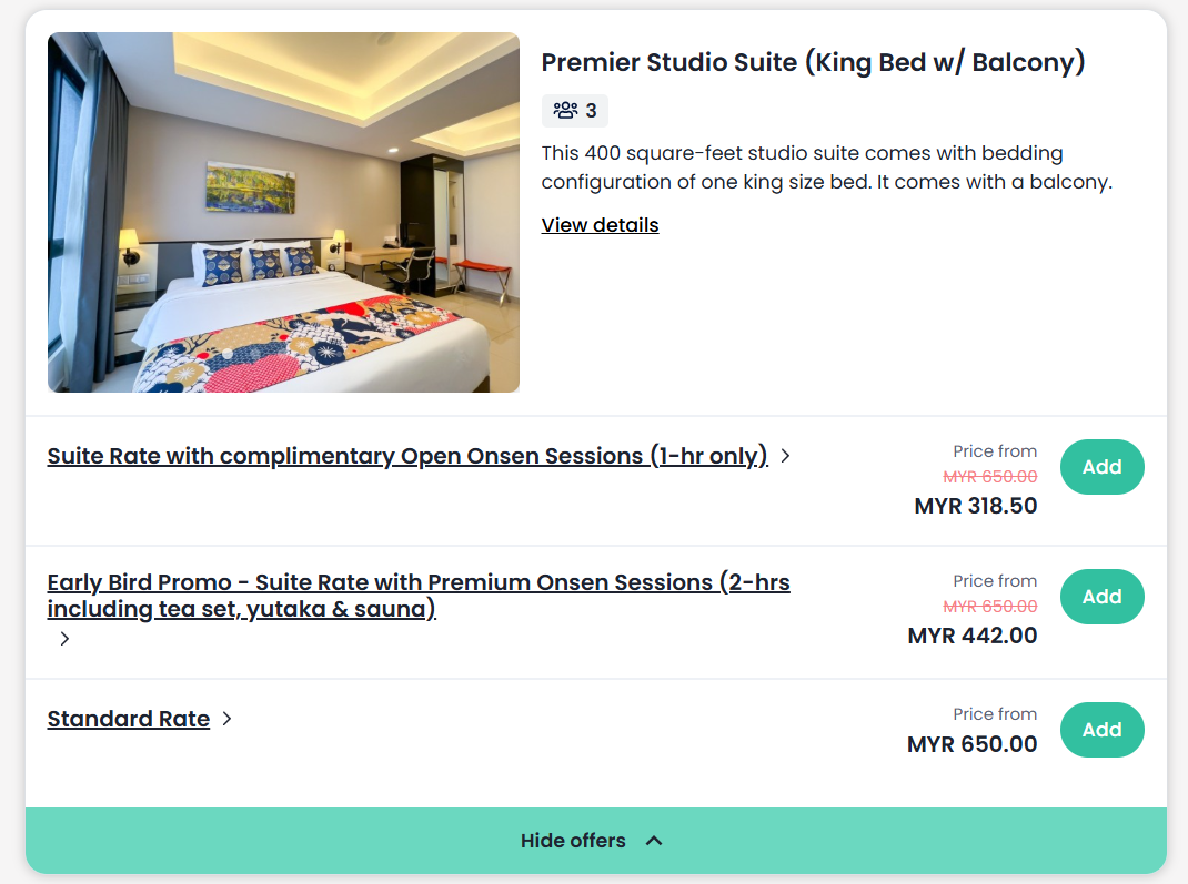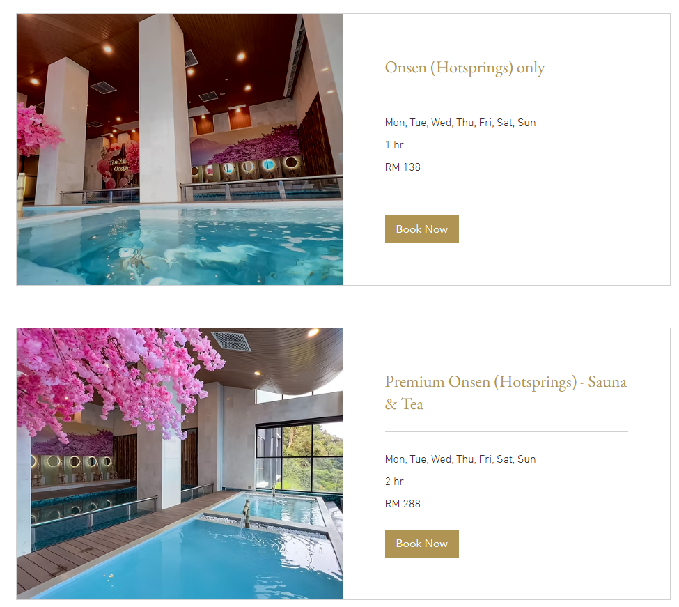 こちらはホテルの公式サイトから拝借したのですが、上記の通り、普通の「Onsen」と「Premium Onsen」があるといった具合です。普通のほうはOpenと書かれていることもありました。