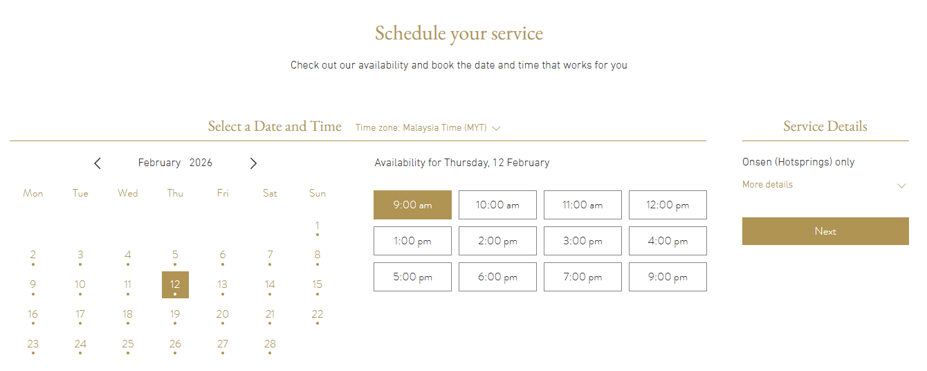 先ほどもご紹介した通り、日帰りのプランもあるようです。ホテルの公式サイトから「Onsen」と進むと、予約画面に遷移します。日付と開始時刻を指定して、予約する流れです。