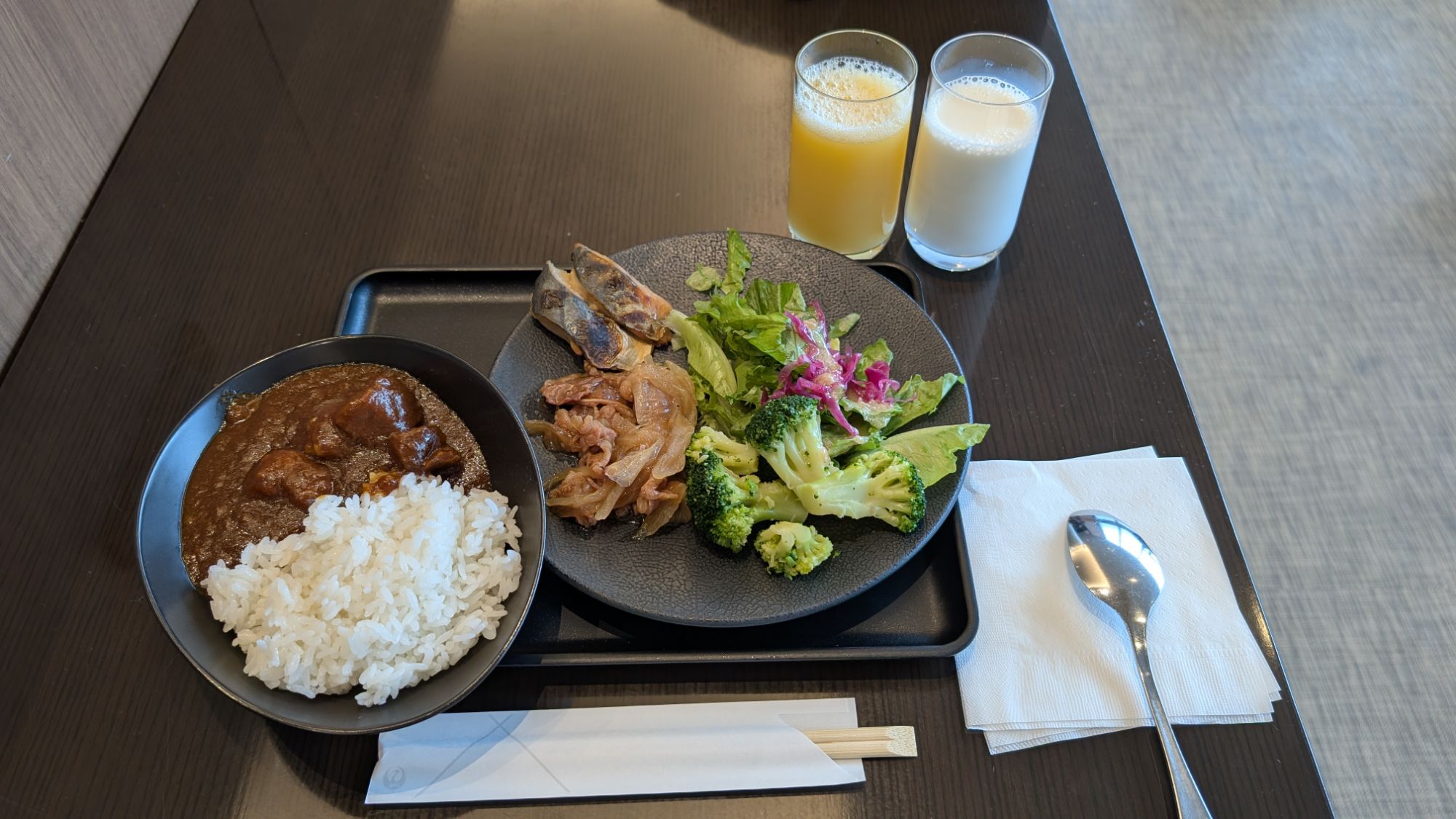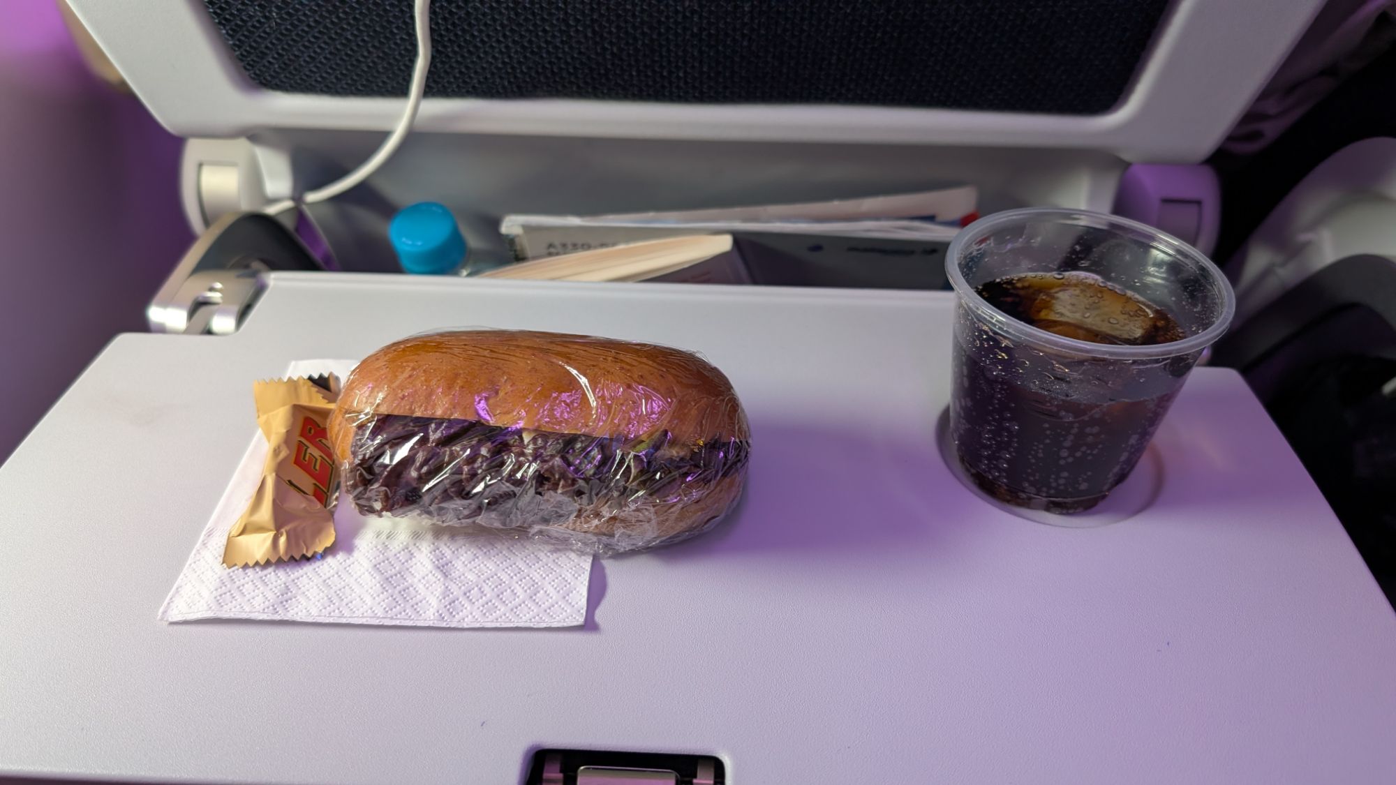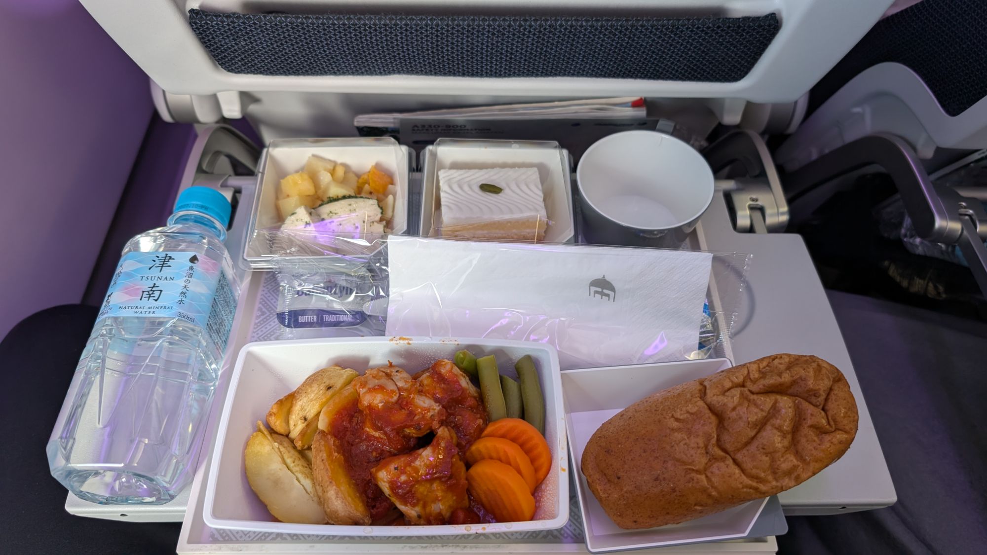 Type-CとType-Aの充電ポートがありました。急速充電にも対応しており、とても快適でした。さて、出発から約2時間後の日本時間12時頃に、機内食が配られ始めました。選択肢は、チキンとポテトorフィッシュとライスと言っていました。