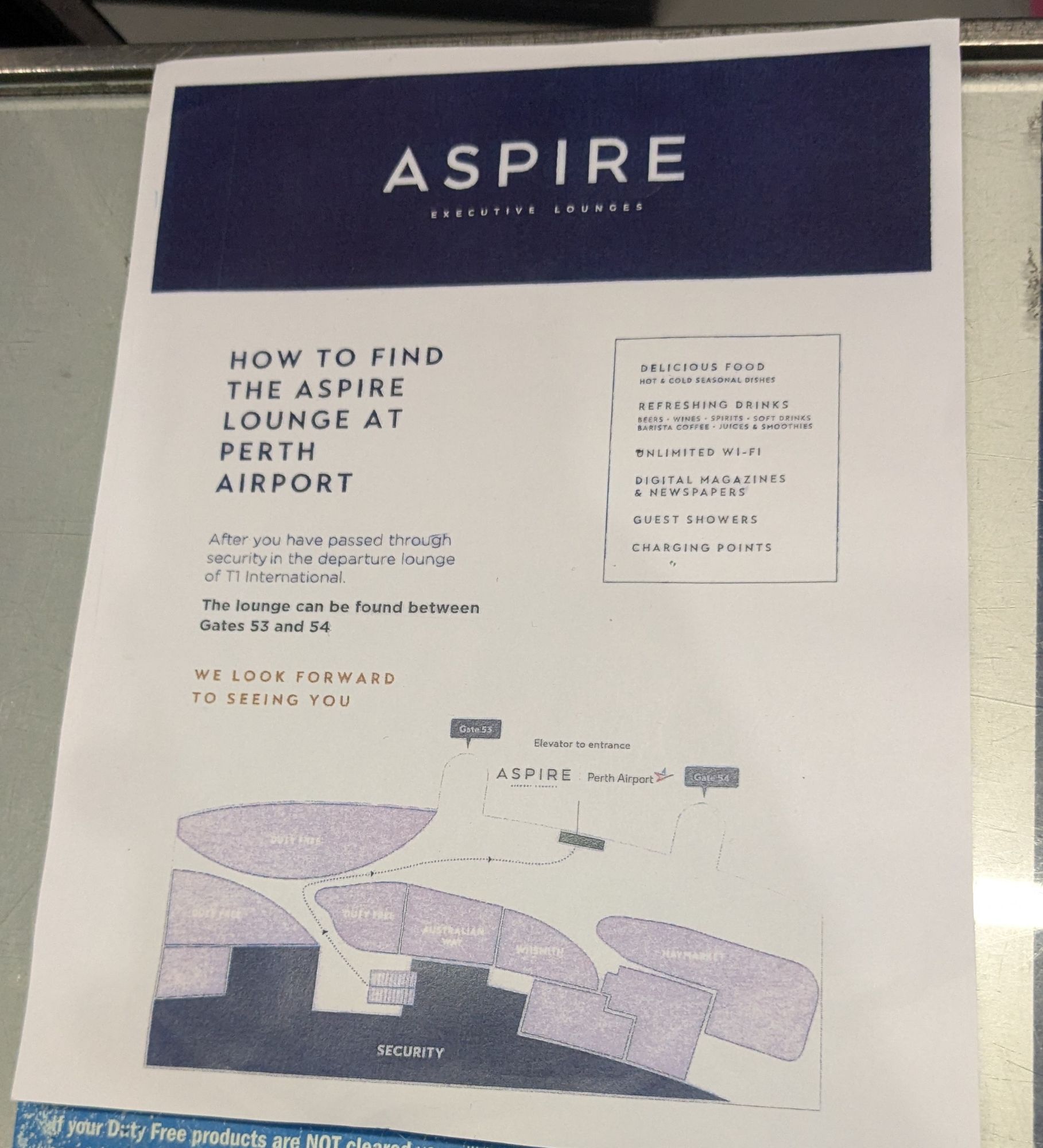 パース⇔成田のANA便利用の復路、パース空港でのラウンジとして「Aspire Lounge(アスパイアラウンジ)」が割り当てられました。今回はその際のレビューをしていきたいと思います。さっそくよろしくお願いします。