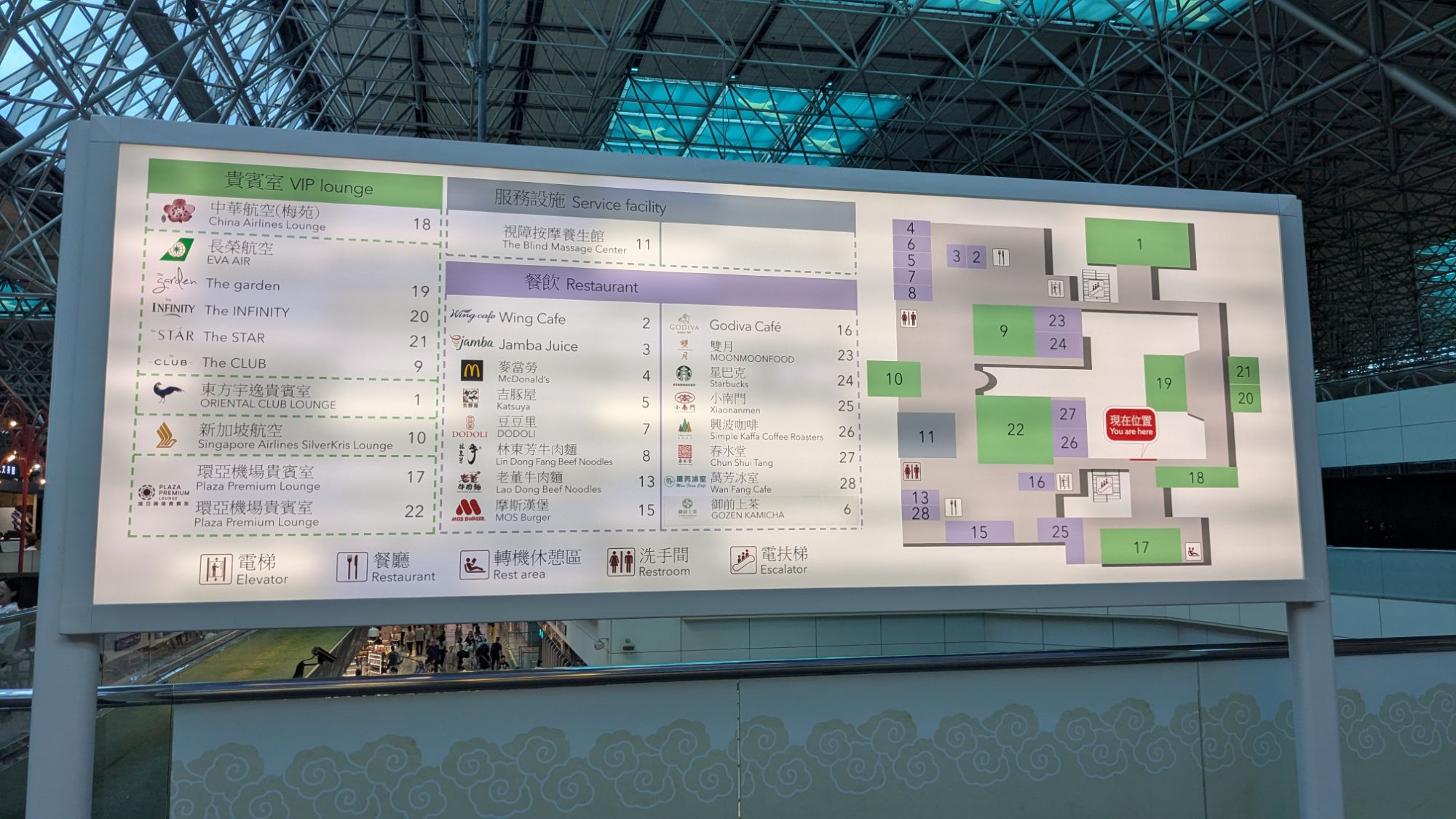 正面にこのようなフロアマップが見えるはずです。今回のOriental Club Loungeはマップの1番にあたります。